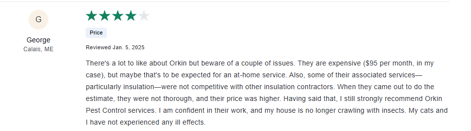 Orkin earns trust for results that work, customers say the pests are gone, but some feel the pricing and upsell tactics can be a bit much compared to local options.