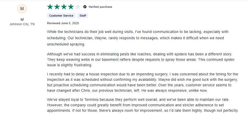 A longtime customer shares their experience with Terminix, noting dependable results but ongoing frustrations with poor communication and scheduling issues.