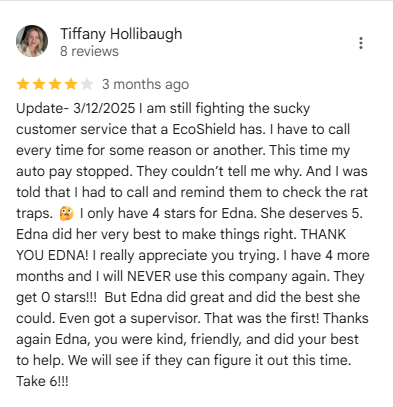 A review of EcoShield highlights friendly service and safe treatments but raises concerns about unresolved pest issues, inconsistent follow-up, and surprise charges.
